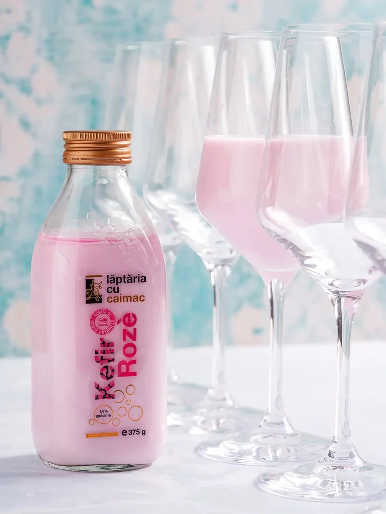 Iar pentru cei care vor ceva diferit, avem și Kefir Rozè, similar cu cel la sticlă ca și drojdii și bacterii lactice dar îmbogățit cu suc natural de sfeclă și țelină (obtinut prin presare la rece).